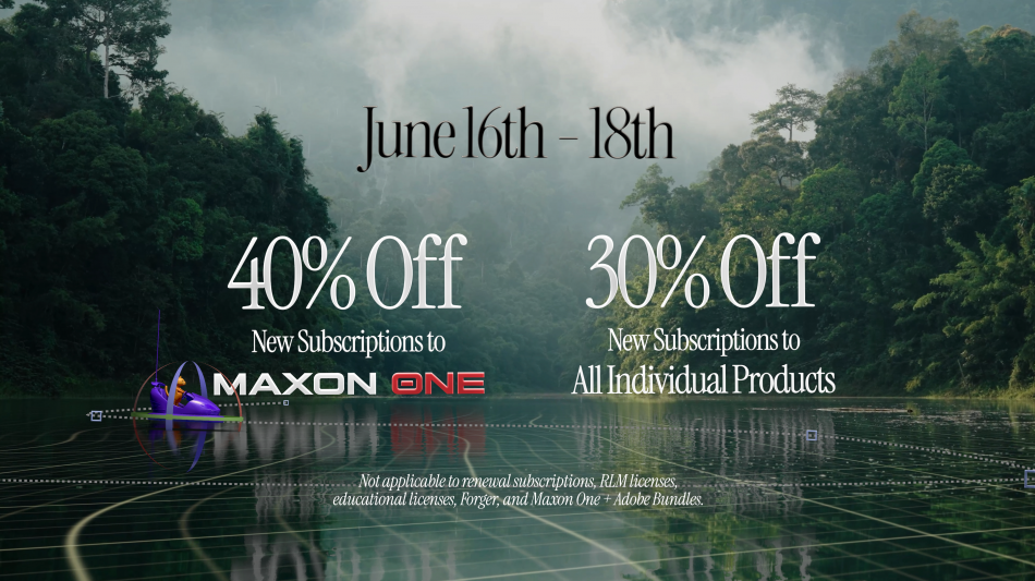 * Promotional prices are exclusive of taxes, and if applicable will be applied at checkout. Offer valid until June 18, 2025. New annual subscriptions only. Discounts are not applicable to renewal subscriptions, RLM licenses, educational licenses, Forger, and Maxon One + Adobe Bundles. Terms apply.